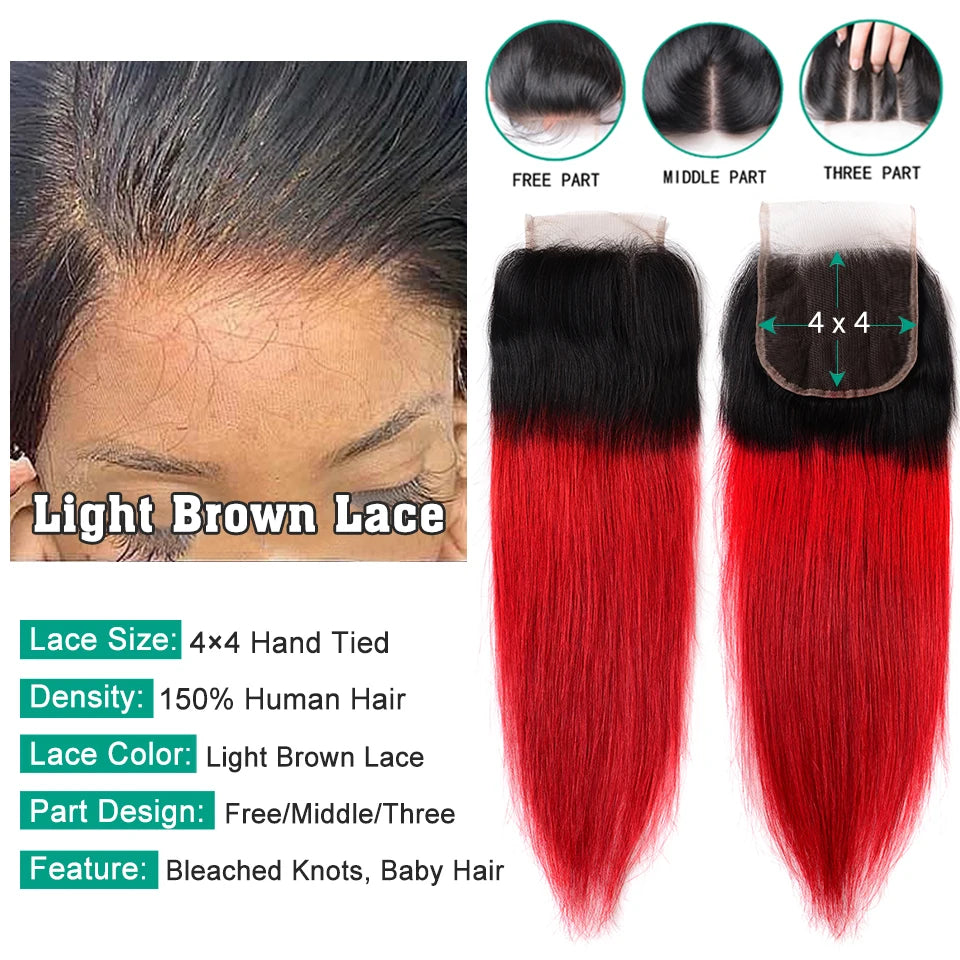 1B 99J Ombre Lace Closure 100% Human Hair 2 Tone Green Blue Burgundy 4x4 Swiss Lace Closures 8 Colors Available Clearance Sale