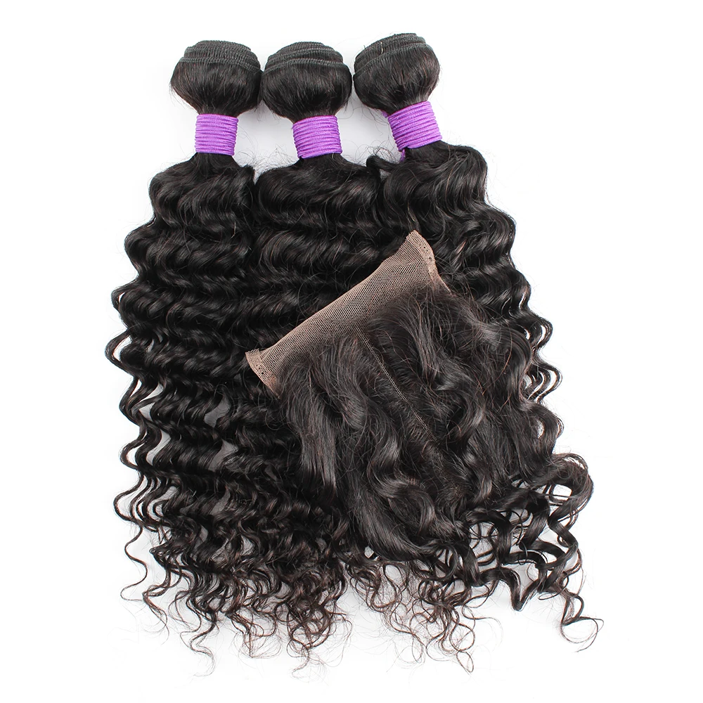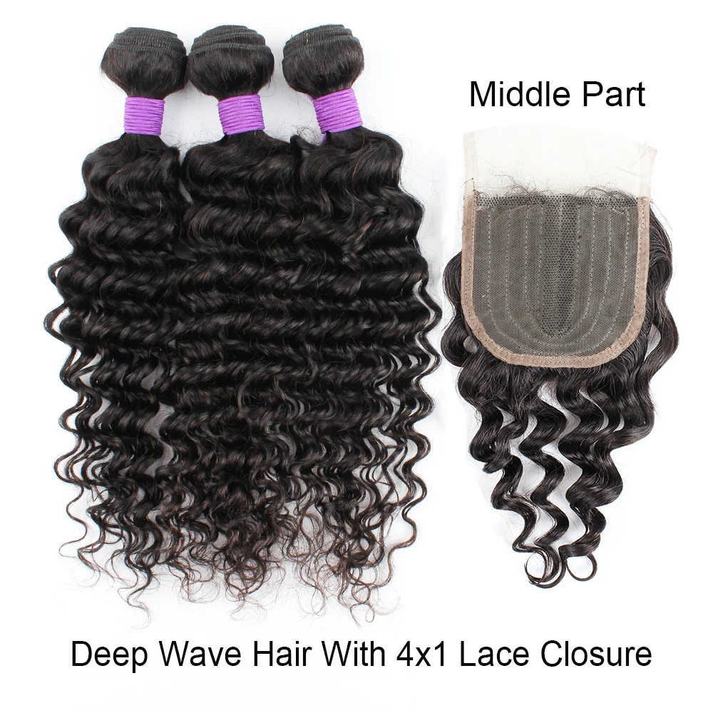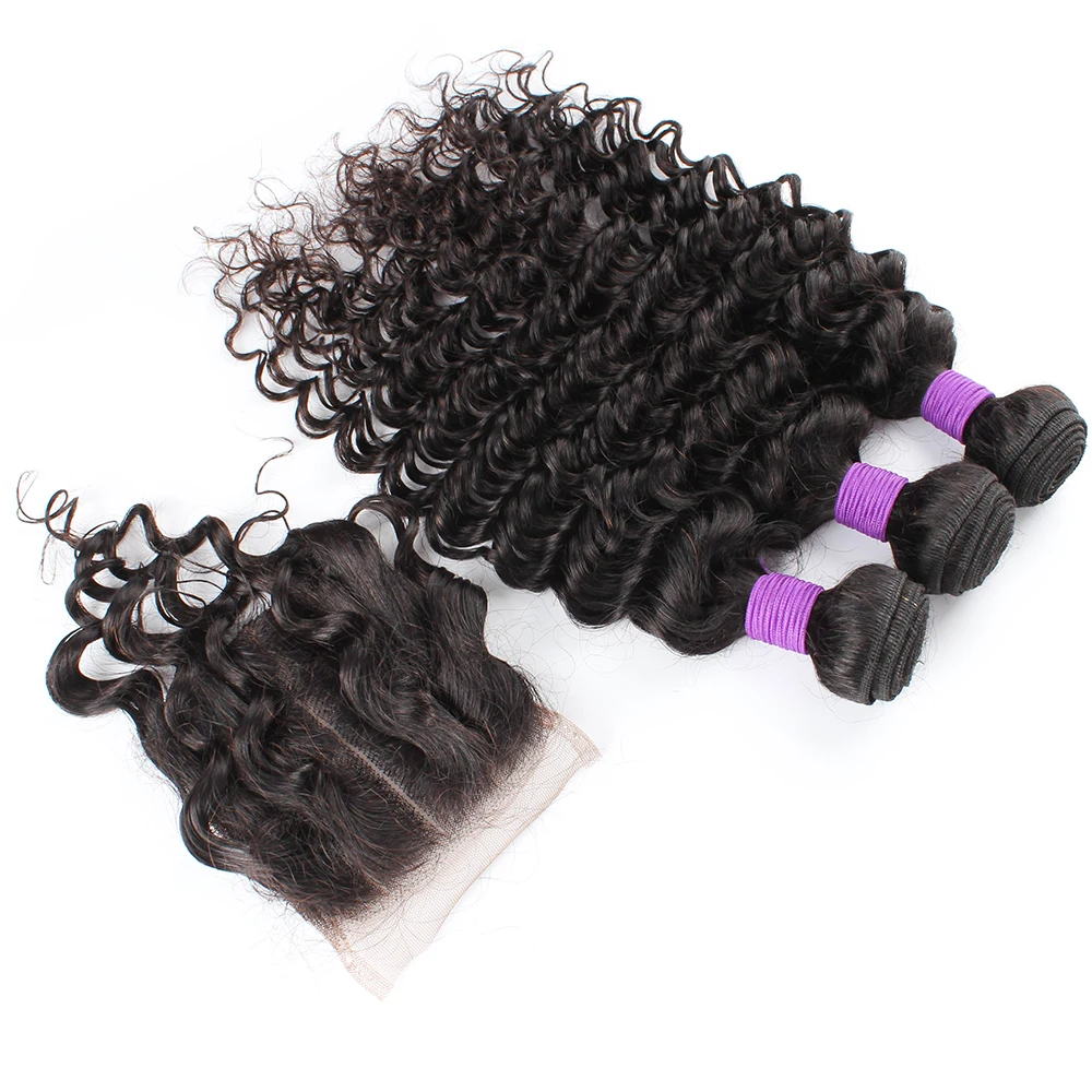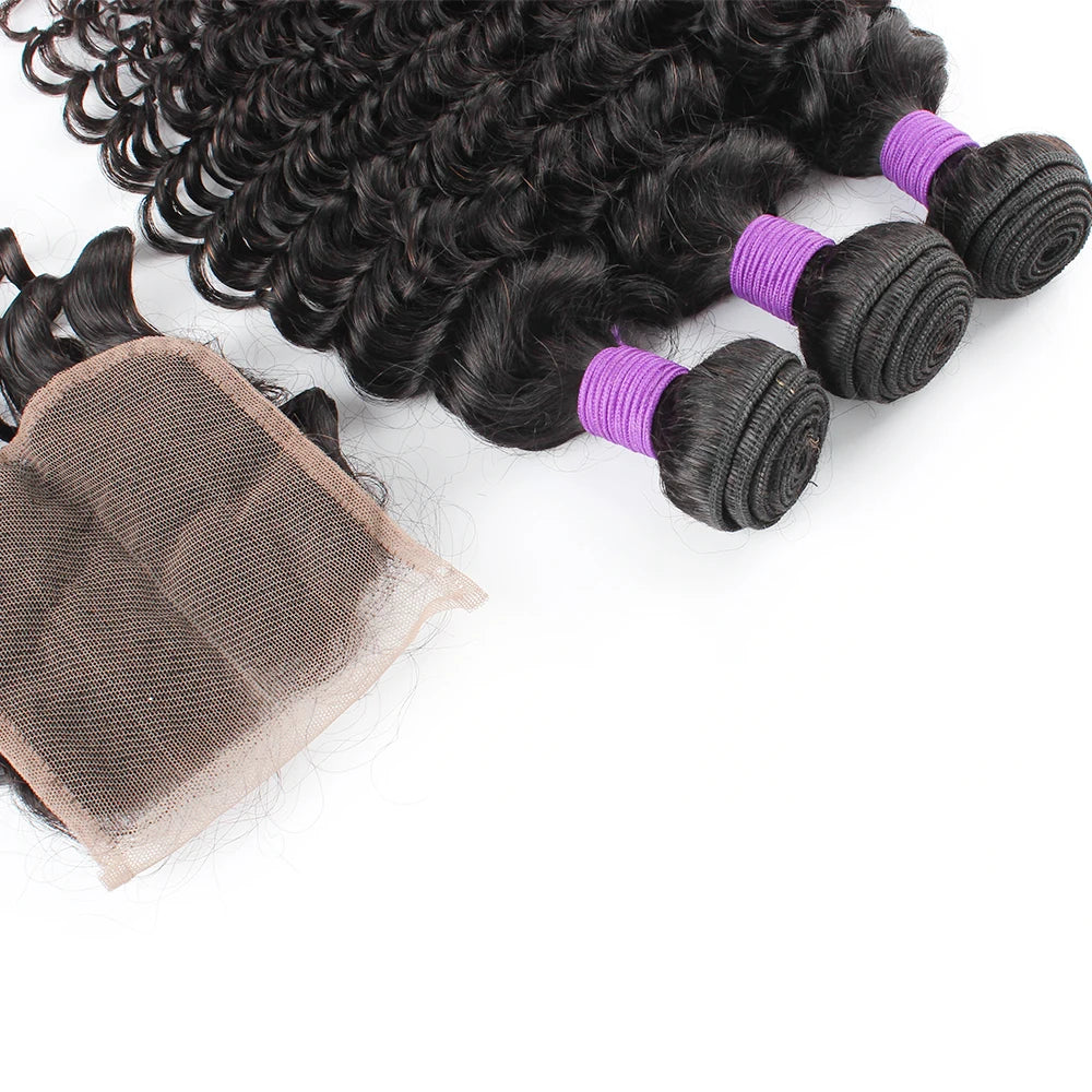 Natural Color Deep Wave Human Hair Bundles With 4x4 Lace Closure Brazilian Remy Hair Extention 200g/Set Free Part Swiss Lace